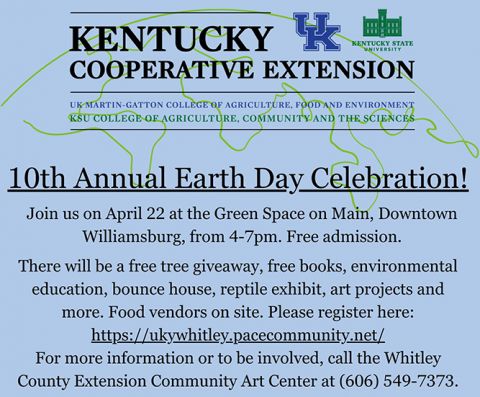 The Whitley County Cooperative Extension Community Arts program will be holding its 10th Annual Earth Day celebration on Monday (April 22) in downtown Williamsburg.