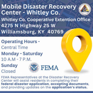The mobile disaster recovery center opened Monday, Aug. 12, and will remain open through Saturday, Aug. 17, at the Whitley County Cooperative Extension Office, which is located at 4275 North US25W, Williamsburg. It will be open from 10 a.m. – 7 p.m. each of those days.