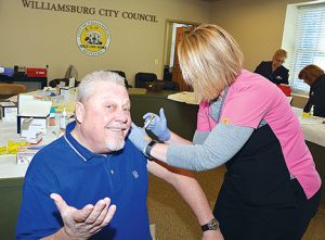 Whitley County Health Department Interim Director Tamara Phelps gave Williamsburg Mayor Roddy Harrison the first of his two-part Hepatitis A vaccination during a free clinic Tuesday afternoon at Williamsburg City Hall.