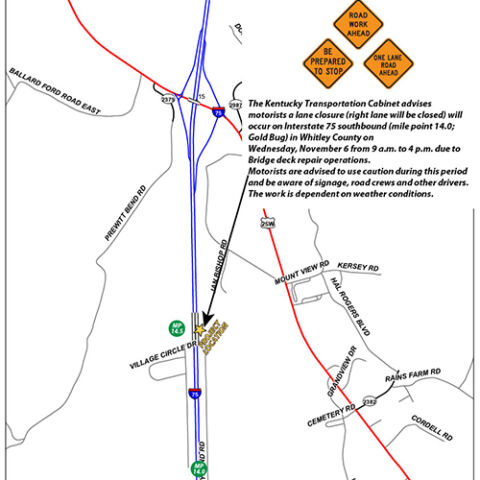 The Kentucky Transportation Cabinet advises motorists a lane closure (right lane will be closed) will occur on I-75 southbound (mile point 14.0; Gold Bug) in Whitley County on Wednesday, Nov.6, from 9 a.m. to 4 p.m. due to bridge deck repair operations.