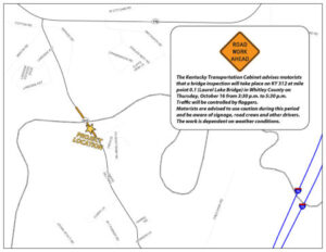 The Kentucky Transportation Cabinet (KYTC) advises motorists that a bridge inspection will take place on KY 312 at mile point 0.1 (Laurel Lake Bridge) in Whitley County on Thursday, October 16 from 3:30 p.m. to 5:30 p.m.