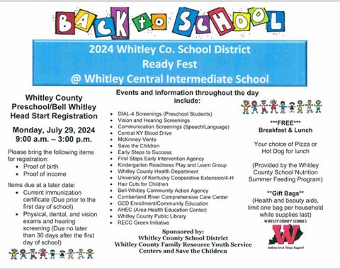 There will also be registration for Whitley County’s preschool program and Bell Whitley Head Start that day. Parents or guardians should bring proof of birth and proof of income when registering.